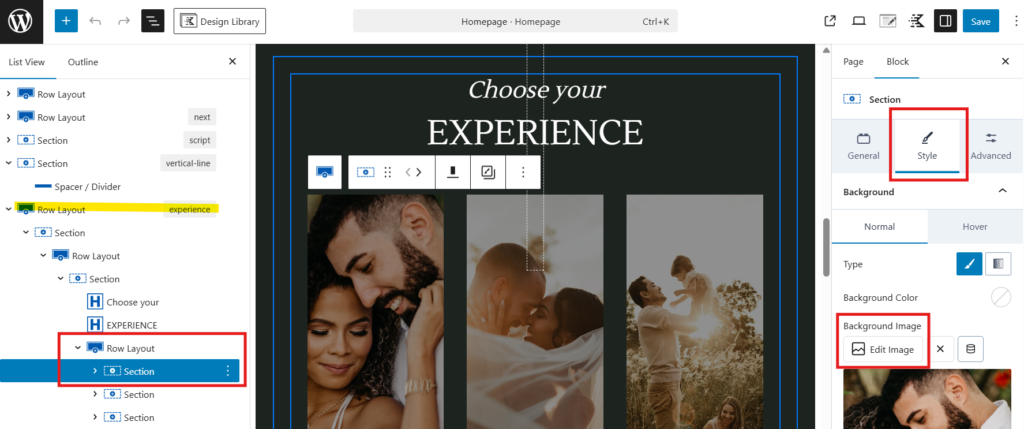 3. Toggle the Background settings and click Edit Image of the Background Image setting.
