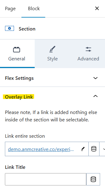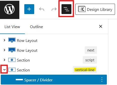 3. Toggle open the vertical-line Section block by clicking on the arrow to the left of the Section.