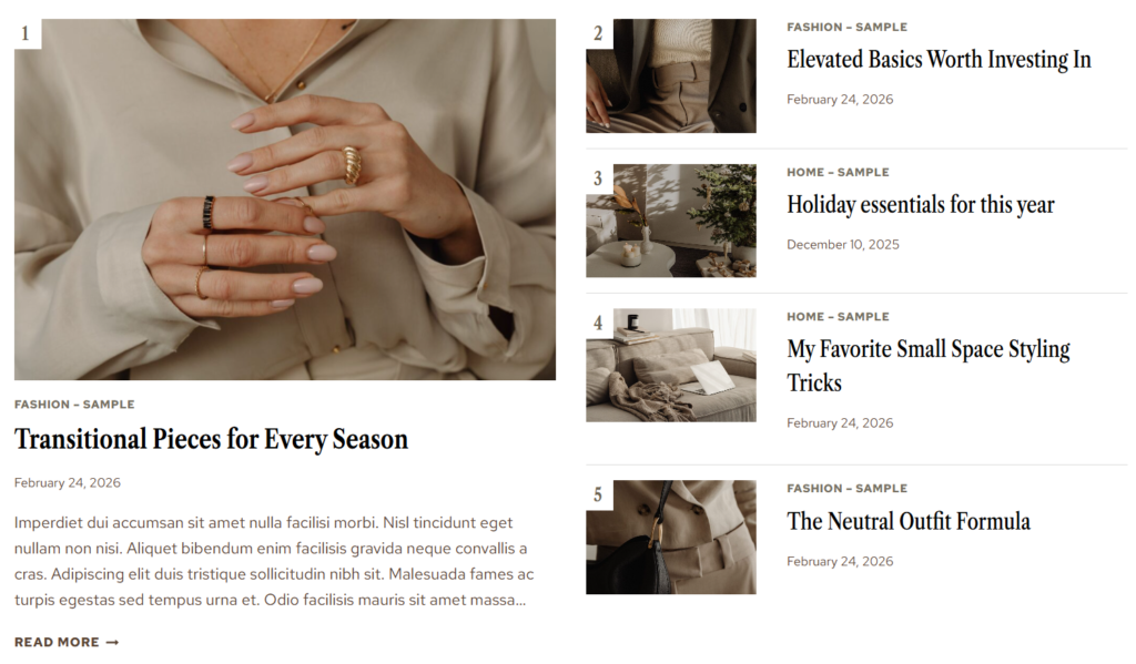 The featured post sections are manual, which makes them great for evergreen or especially important content. The template includes a variation of a photo on the left or the right, as well as a solid-color variation.