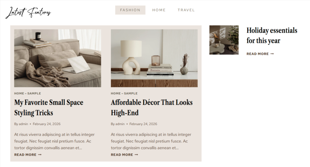 This section uses tabbed content with featured posts assigned by category. The script heading uses your accent font.