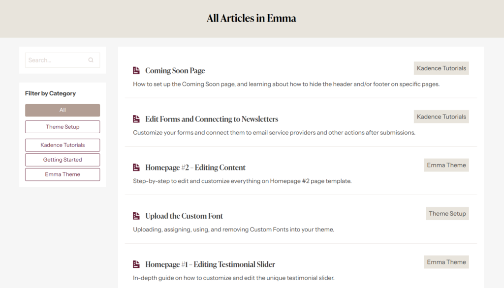 Quickly navigate to the specific theme you’re looking for guides on. These will pull in any and all tutorials related to this theme.