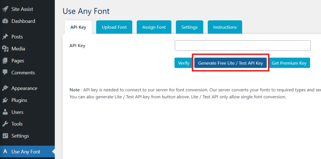 - Open the Use Any Font plugin and click Generate Free Light / Test API Key.