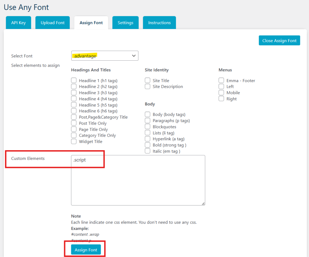 Note: Please confirm in your theme-specific documents that this is the correct Custom Element to assign for your custom font. - Click Assign Font.