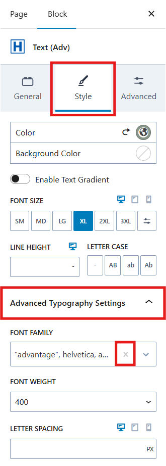 - In the Style tab of the Text Block, toggle the Advanced Typography Settings group.